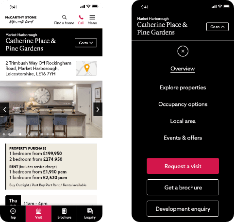 Users were struggling to find the information they were looking for, whether it be about the available properties, ongoing costs or the local area. The existing sub-navigation on mobile devices, a small dropdown above the introduction text, was being missed by users. The CTAs on the page were also getting lost by users causing them to exit the page or website before converting.